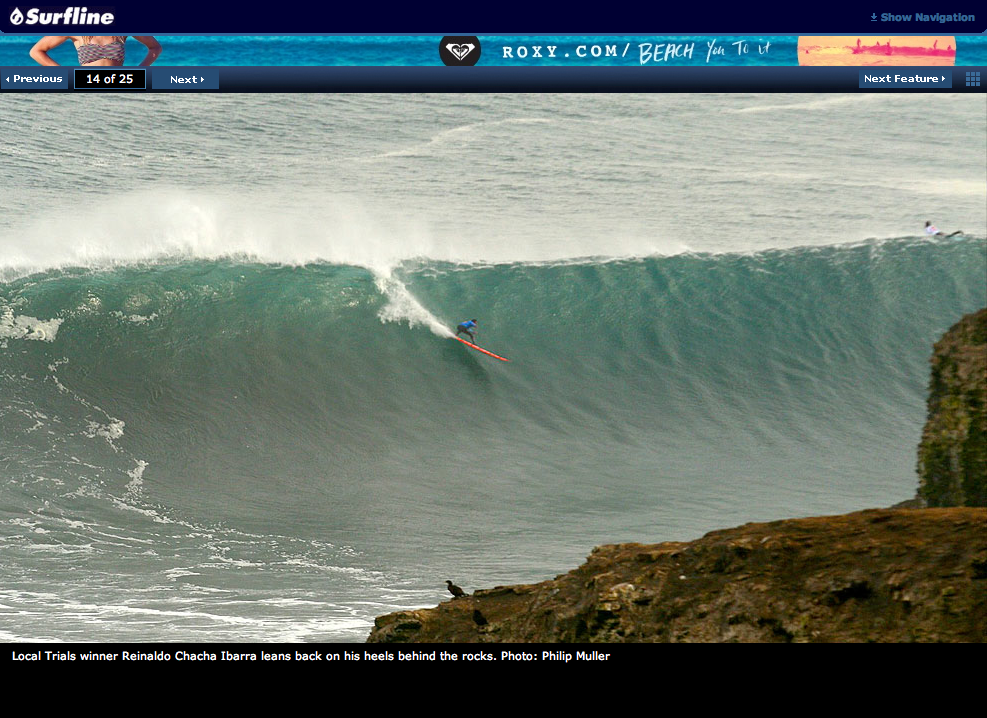 FELICITACIONES son lo menos que le podemos dar a Nuestro Big Rider Reinaldo CHACHA Ibarra, ganador 2 veces consecutivas de los trials y a la hora del ceremonial peleando palmo a palmno con los Mejores Big Waves Riders del Mundo, Si bien no pudo avanzar Mucho esta foto es una pequeña Muestra de nuestro gran competidor Dropeando en el aire en Serious Monster Wave. Solo me queda destacar su 4o Lugar en su heat Ganandole a Rusty Long y a otro mas que por ahora no recuerdo…